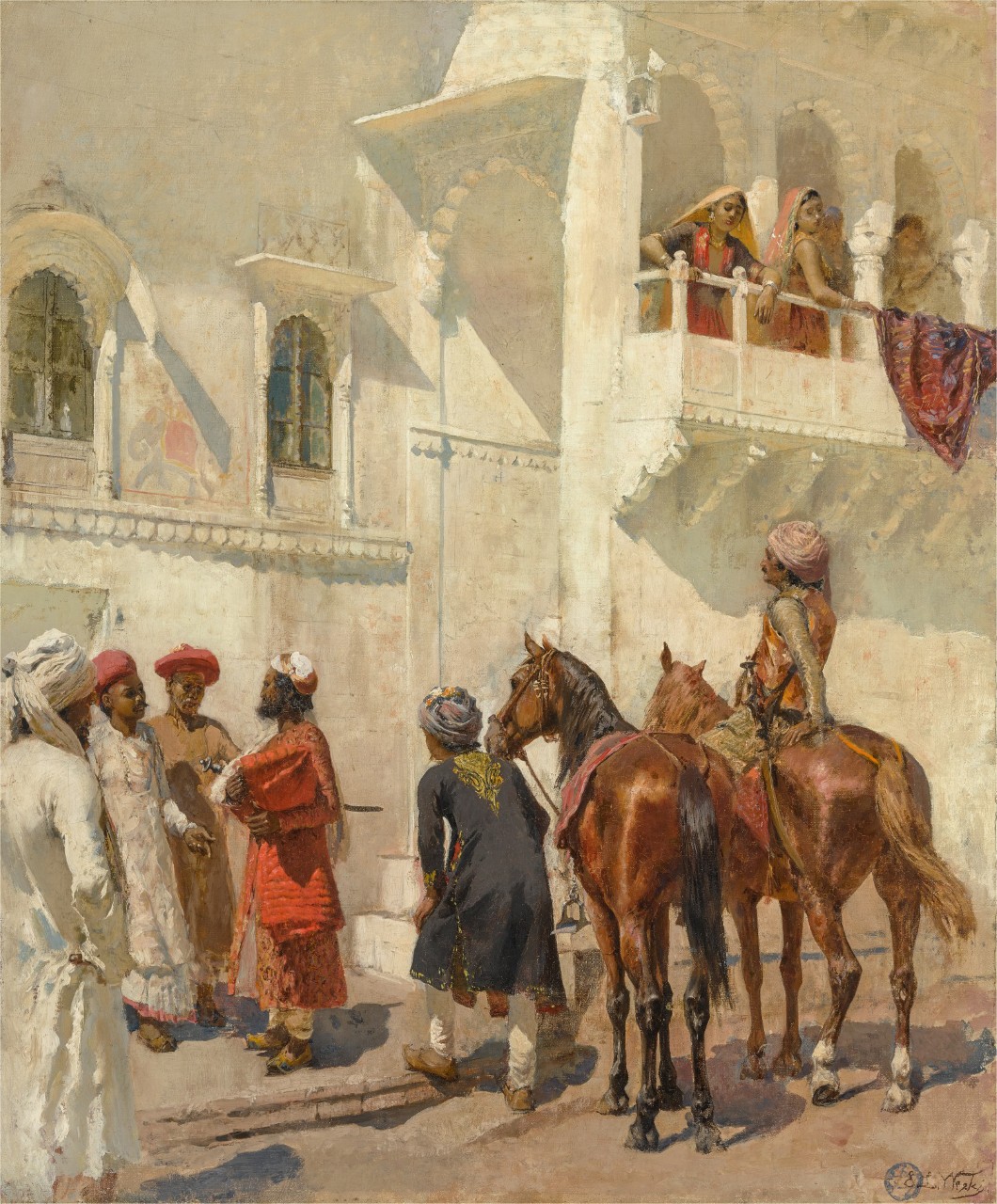 Before the Hunt (1880s) depicts a moment of calm preparation in an Indian courtyard, where a group of men stand at the ready with horses, though it’s unclear if they’re about to embark for a hunt or have just returned. The scene unfolds before an exquisite white marble building with intricately carved and frescoed walls, including decorative elephants between windows. Above, a group of ladies in colorful garb contrast against the white screened porch where they seek shade and observe the men below. Weeks masterfully captures the architectural grandeur and cultural richness of India, painted during his 1880s travels. His wonderful eye for architecture and ability to draw ethnic types without condescension creates an authentic glimpse into Indian court life, marked by his distinctive seal.