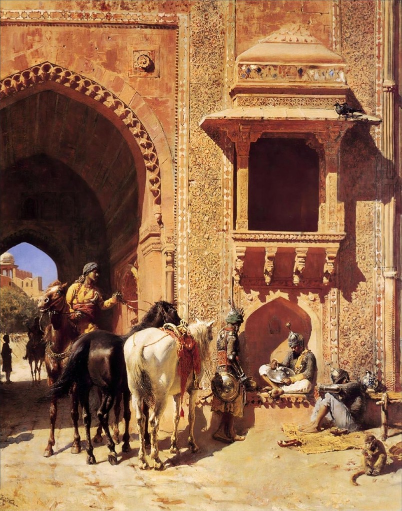 Gate of the Fortress at Agra, India created in the Orientalism style, vividly captures a scene at the entrance of the Agra Fort. The painting, dating back to the 1880s, is celebrated for its detailed and lifelike depiction of the fortress gate and its surroundings. Weeks masterfully uses color to illustrate sunlight reflecting off the sandstone, highlighting the textures and hues of the architecture. Soldiers, horses, and other figures animate the scene, adding depth and a sense of everyday life. The artist’s skill in linear perspective creates an illusion of depth, drawing viewers into the painting as if they were standing at the gate themselves.