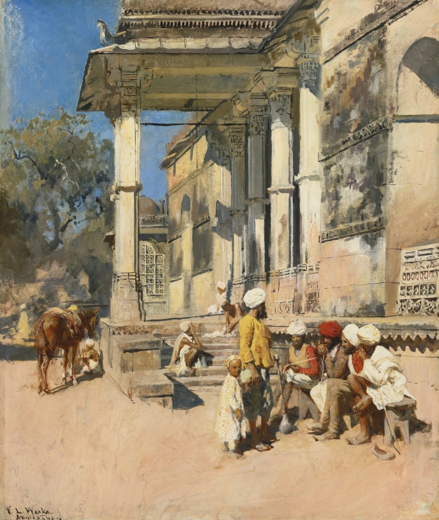 Portico of a Mosque, Ahmedabad vividly captures the side entrance of a mosque in Ahmedabad, India, likely the Mosque of Shah Alun. The painting, rendered in oil on canvas, showcases the artist’s mastery in depicting architectural grandeur and everyday life. The portico, with its ornate columns and steps, serves as a social hub where figures—locals in traditional attire—gather, rest, and converse. Weeks painted the architecture on-site during his travels to India (1887–93), later adding the figures and animals in his Paris studio, possibly using sketches and photographs for reference.