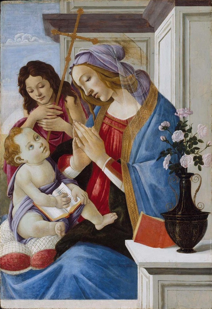 Sandro Botticelli’s Virgin and Child with Saint John the Baptist (c 1500) is a masterpiece, showcasing his late style with refined elegance and devotional intimacy.